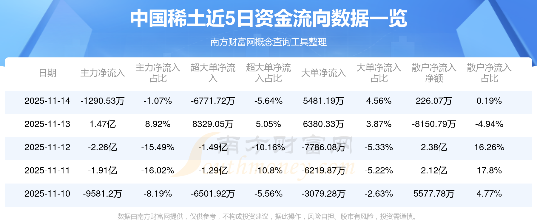 11月14日消息,中國稀土資金凈流出1290.53萬元,超大單資金凈流出6771.72萬元,換手率2.39%,成交金額12.01億元。