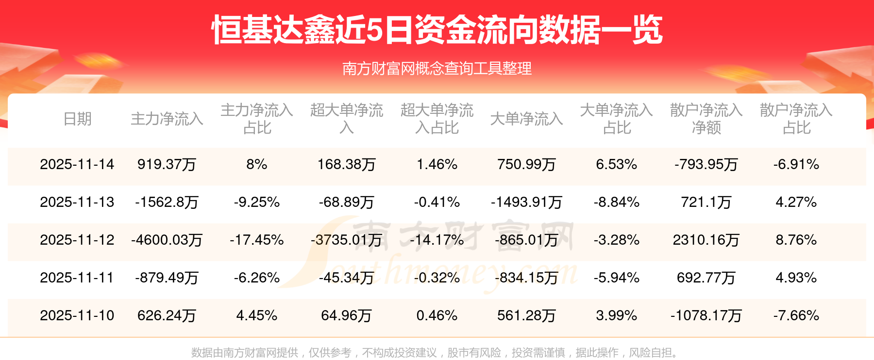 11月14日消息,恒基達(dá)鑫主力資金凈流入919.37萬元,超大單資金凈流入168.38萬元,散戶資金凈流出793.95萬元。