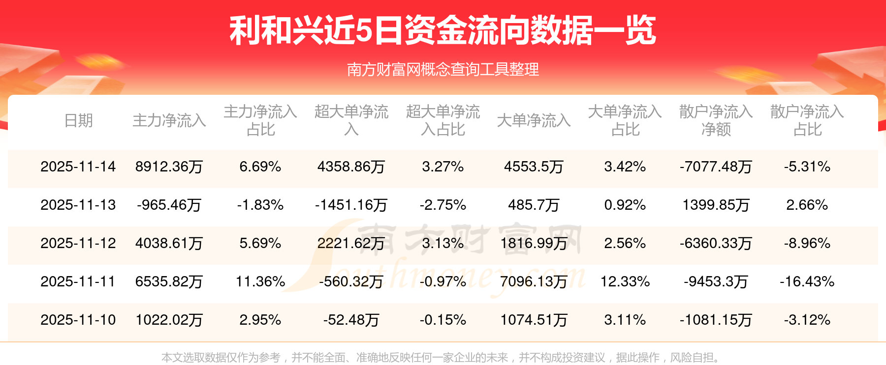 11月14日消息,利和興11月14日主力資金凈流入8912.36萬元,超大單資金凈流入4358.86萬元,大單資金凈流入4553.5萬元,散戶資金凈流出7077.48萬元。
