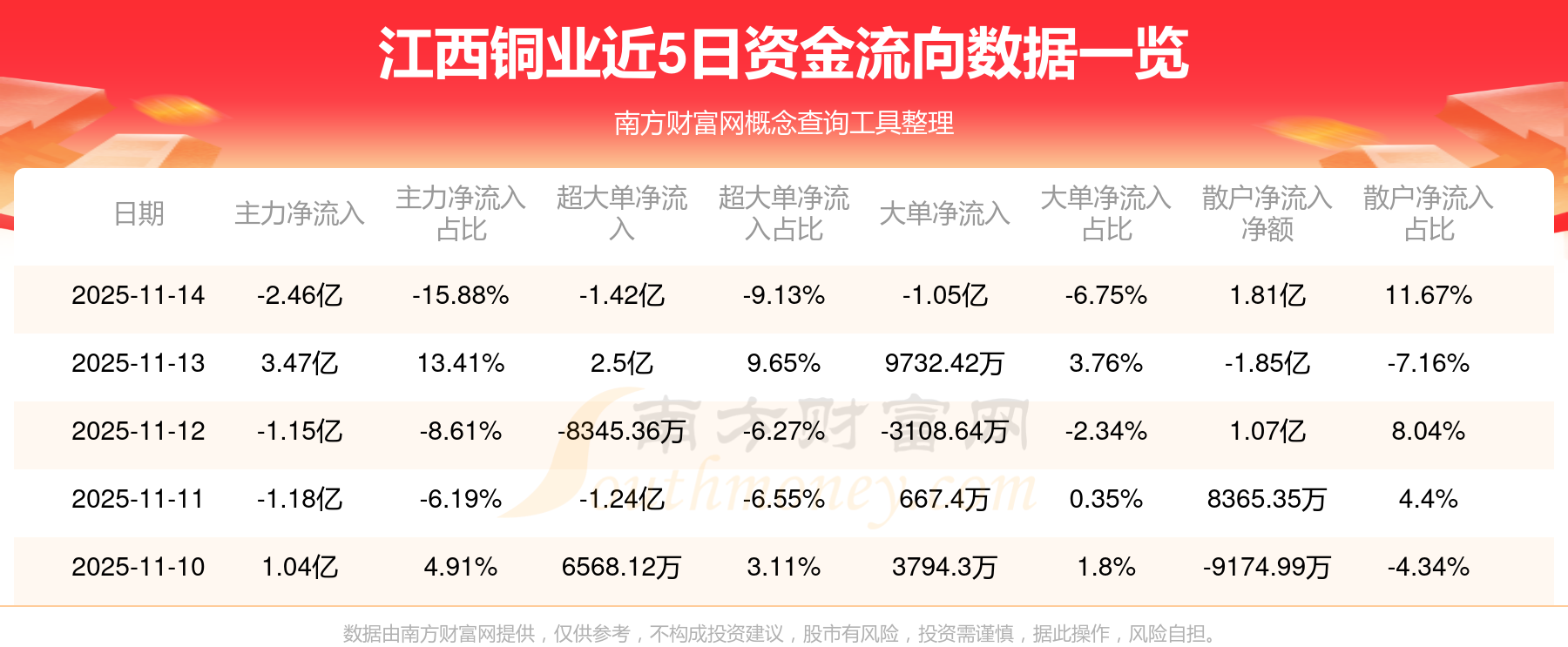 11月14日消息,江西銅業(yè)主力資金凈流出2.46億元,超大單資金凈流出1.42億元,散戶資金凈流入1.81億元。