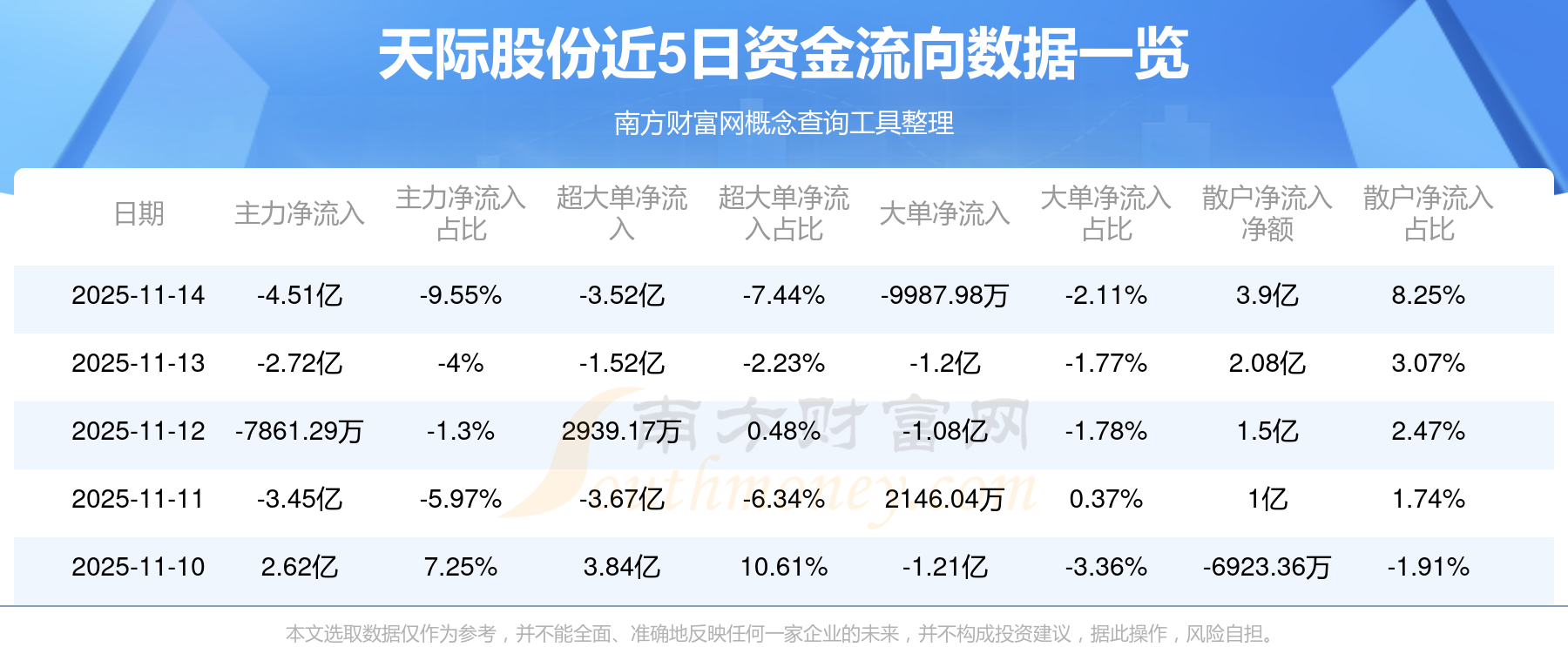 11月14日消息,天際股份主力凈流出4.51億元,超大單凈流出3.52億元,散戶凈流入3.9億元。