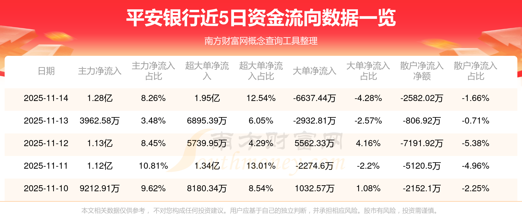 11月14日消息,平安銀行資金凈流入1.28億元,超大單凈流入1.95億元,換手率0.68%,成交金額15.52億元。