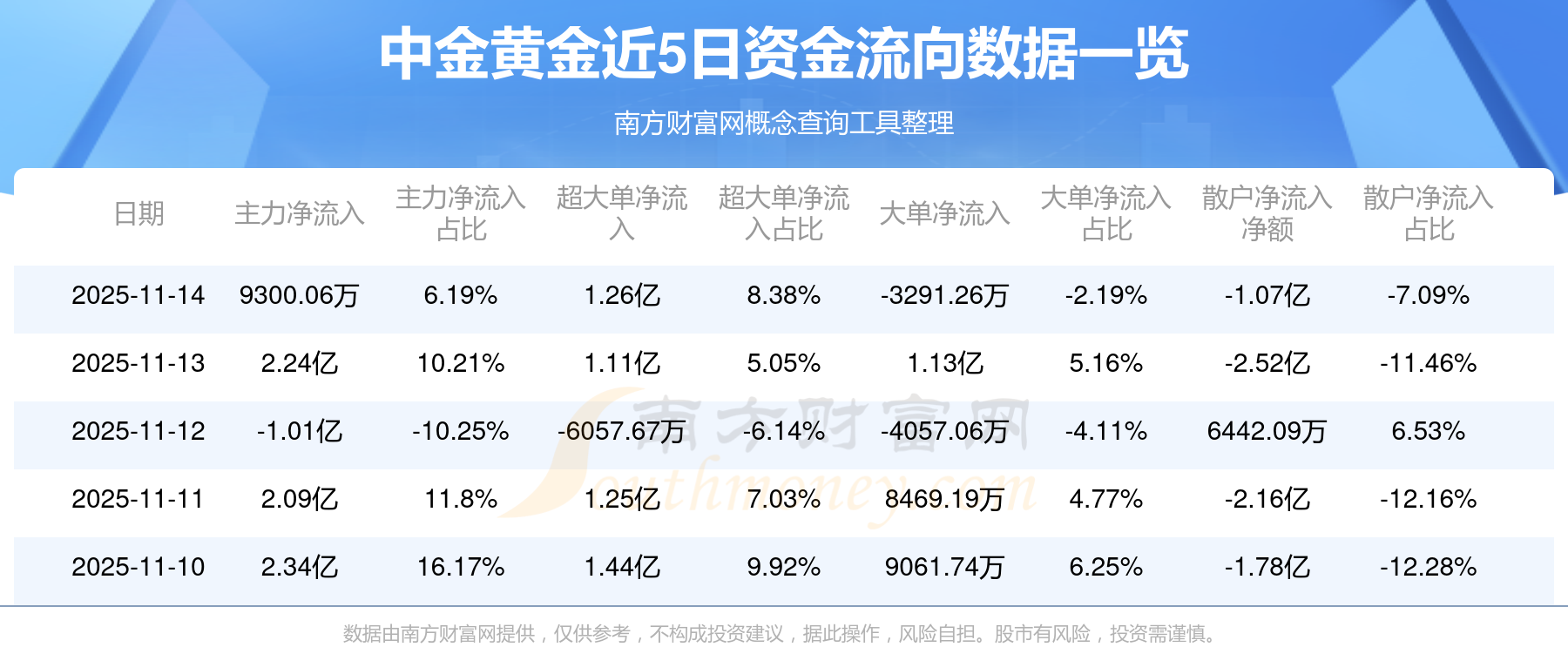 11月14日消息,中金黃金11月14日主力資金凈流入9300.06萬(wàn)元,超大單資金凈流入1.26億元,大單資金凈流出3291.26萬(wàn)元,散戶資金凈流出1.07億元。
