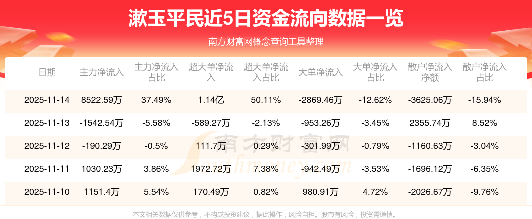 11月14日該股主力凈流入8522.59萬(wàn)元,超大單凈流入1.14億元,大單凈流出2869.46萬(wàn)元,中單凈流出4897.53萬(wàn)元,散戶凈流出3625.06萬(wàn)元。