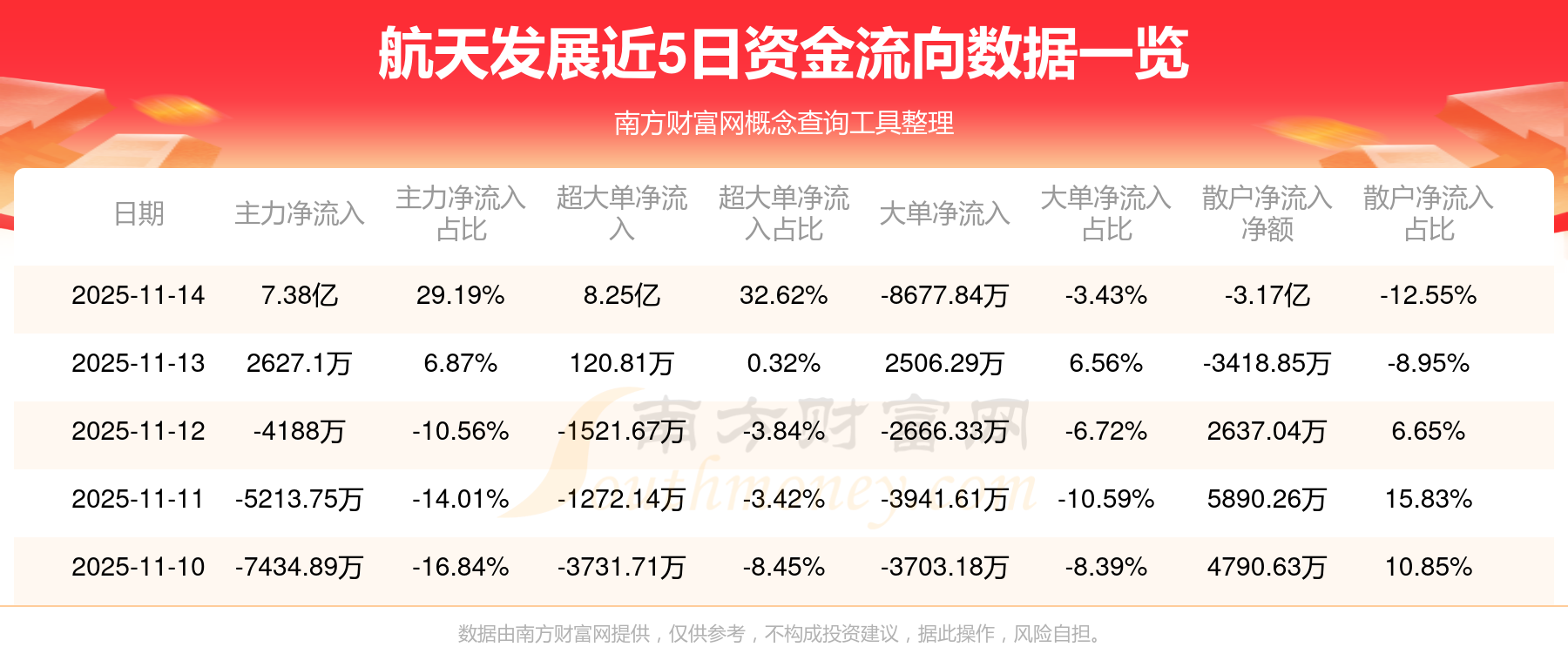 11月14日消息,航天發(fā)展主力凈流入7.38億元,超大單凈流入8.25億元,散戶凈流出3.17億元。
