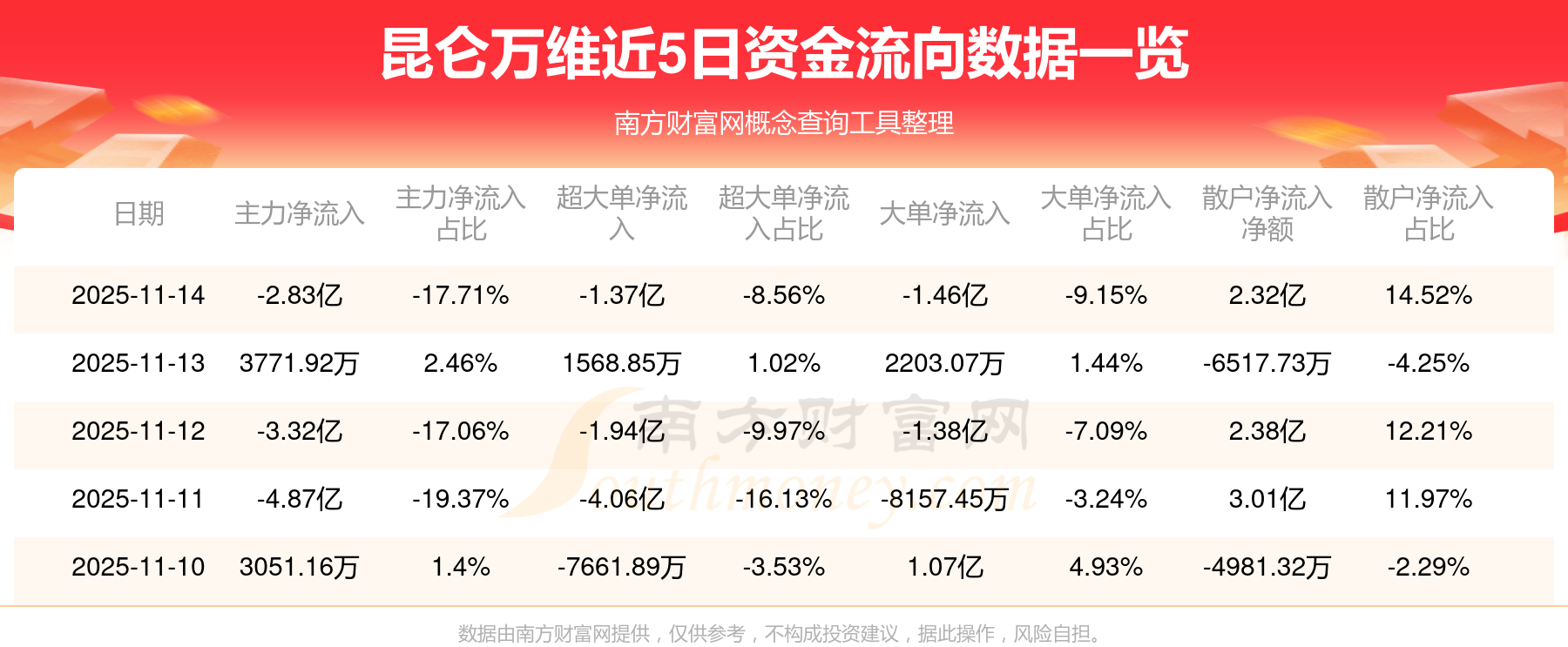 資金流向數(shù)據(jù)方面,11月14日主力資金凈流流出2.83億元,超大單資金凈流出1.37億元,大單資金凈流出1.46億元,散戶資金凈流入2.32億元。