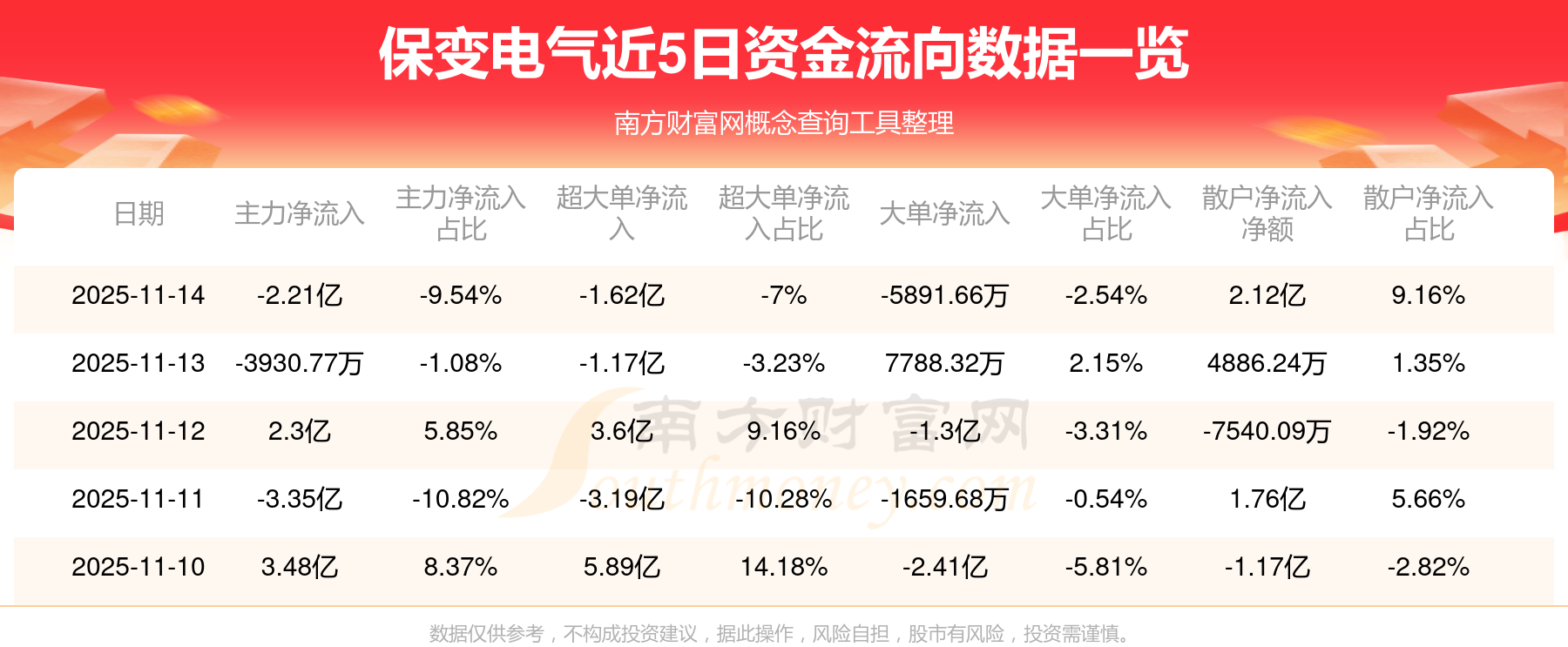11月14日消息,保變電氣11月14日主力資金凈流出2.21億元,超大單資金凈流出1.62億元,大單資金凈流出5891.66萬(wàn)元,散戶資金凈流入2.12億元。
