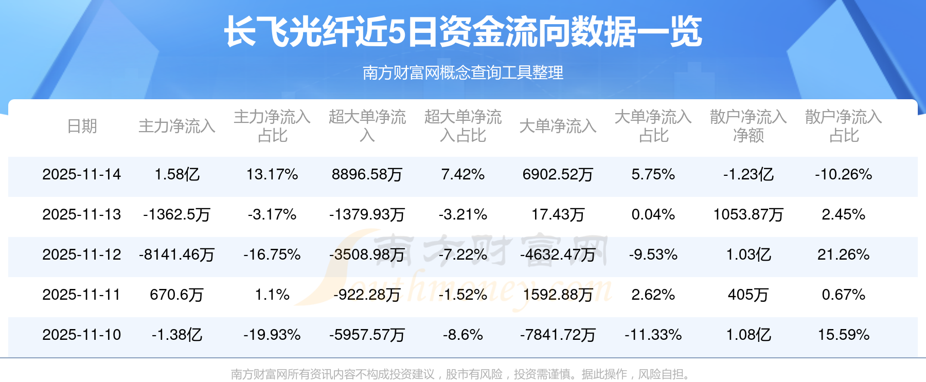11月14日消息,長(zhǎng)飛光纖主力凈流入1.58億元,超大單凈流入8896.58萬(wàn)元,散戶凈流出1.23億元。