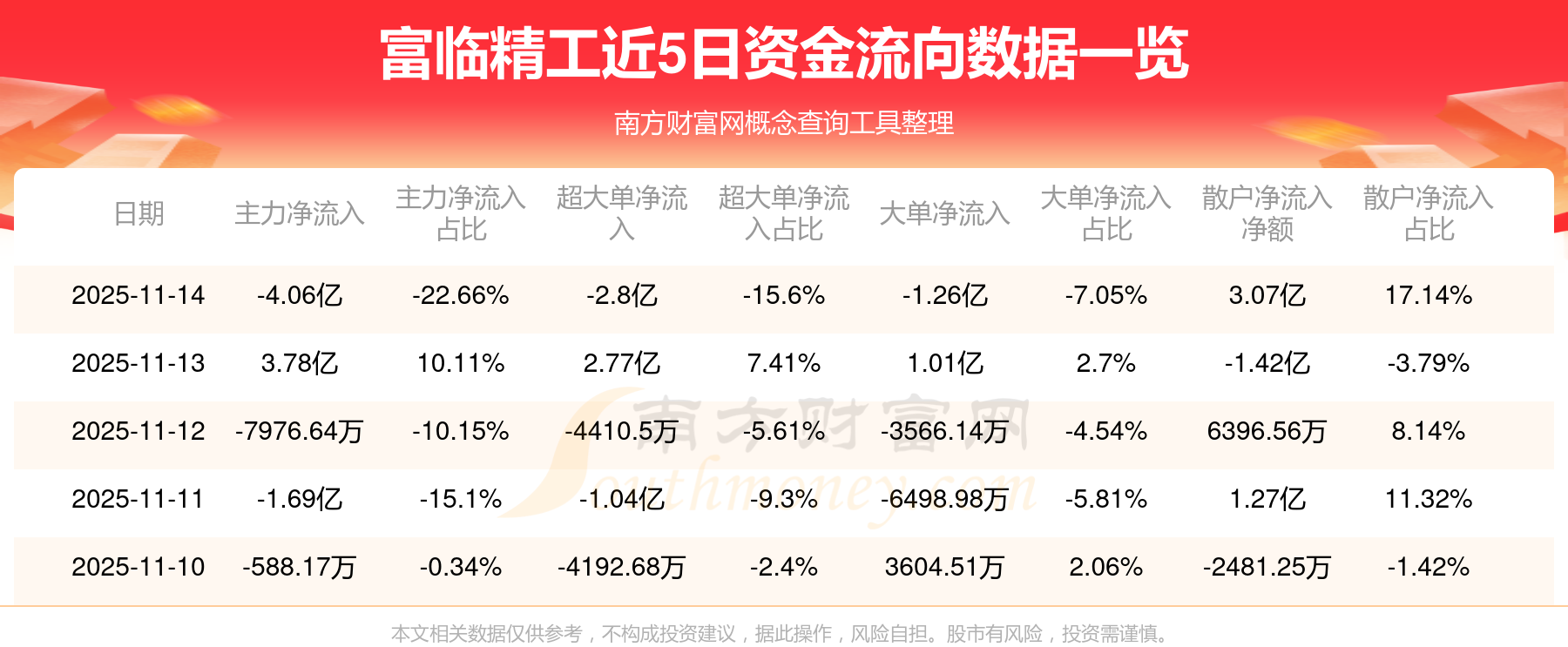 11月14日消息,富臨精工11月14日主力資金凈流出4.06億元,超大單資金凈流出2.8億元,大單資金凈流出1.26億元,散戶資金凈流入3.07億元。
