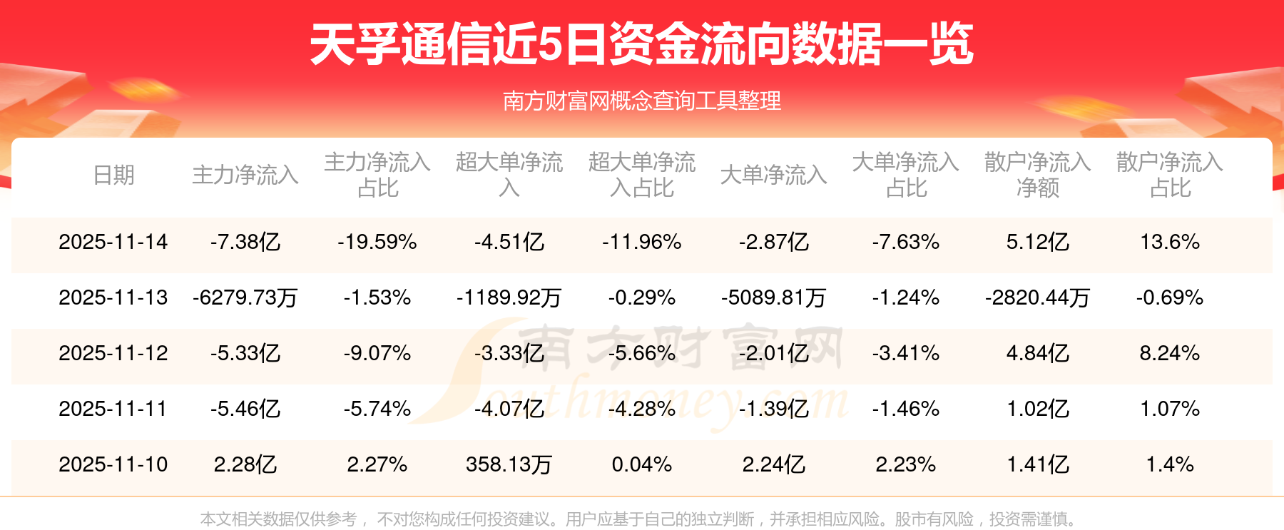 11月14日消息,天孚通信資金凈流出7.38億元,超大單資金凈流出4.51億元,換手率3.09%,成交金額37.65億元。