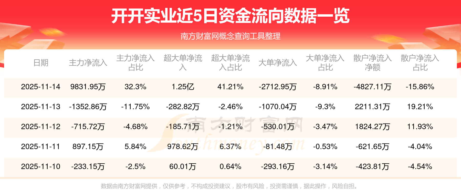 11月14日消息,開(kāi)開(kāi)實(shí)業(yè)11月14日主力凈流入9831.95萬(wàn)元,超大單凈流入1.25億元,大單凈流出2712.95萬(wàn)元,散戶凈流出4827.11萬(wàn)元。
