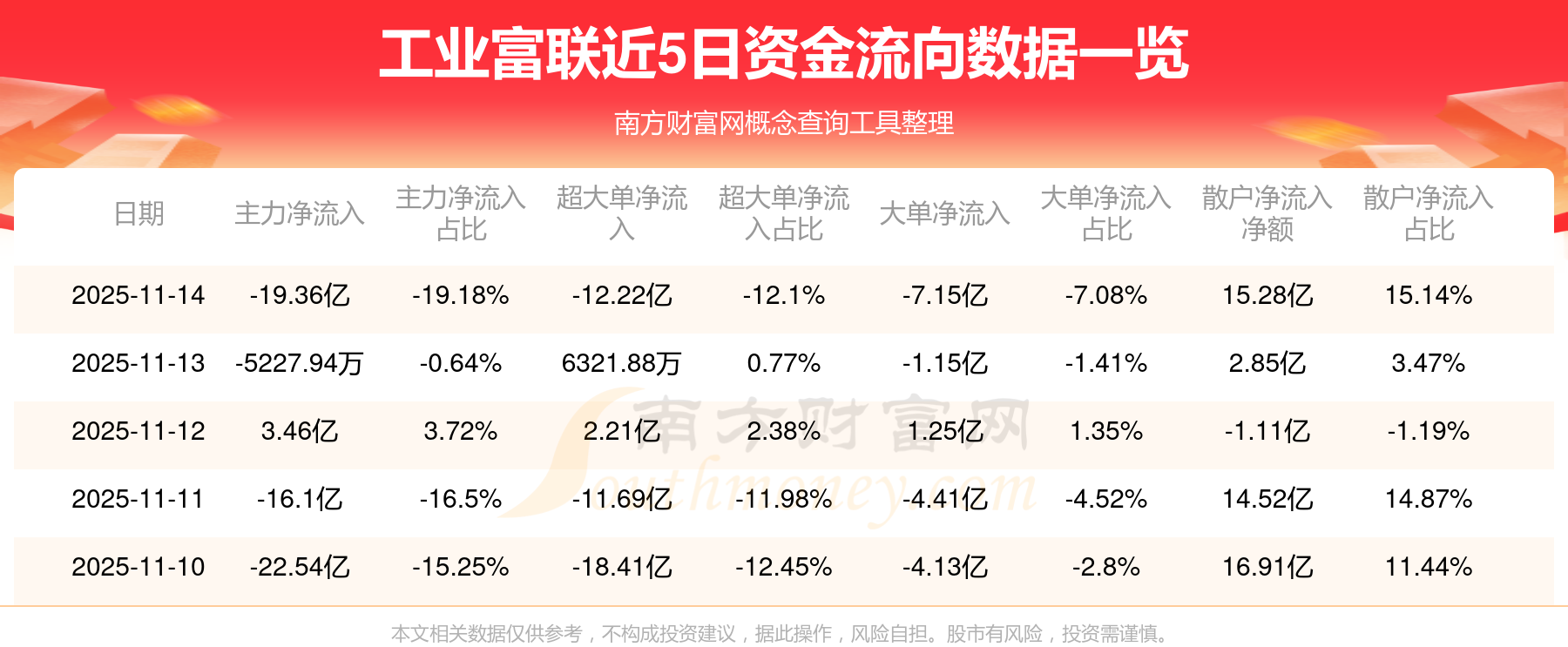 11月14日消息,工業(yè)富聯(lián)11月14日主力凈流出19.36億元,超大單凈流出12.22億元,大單凈流出7.15億元,散戶凈流入15.28億元。