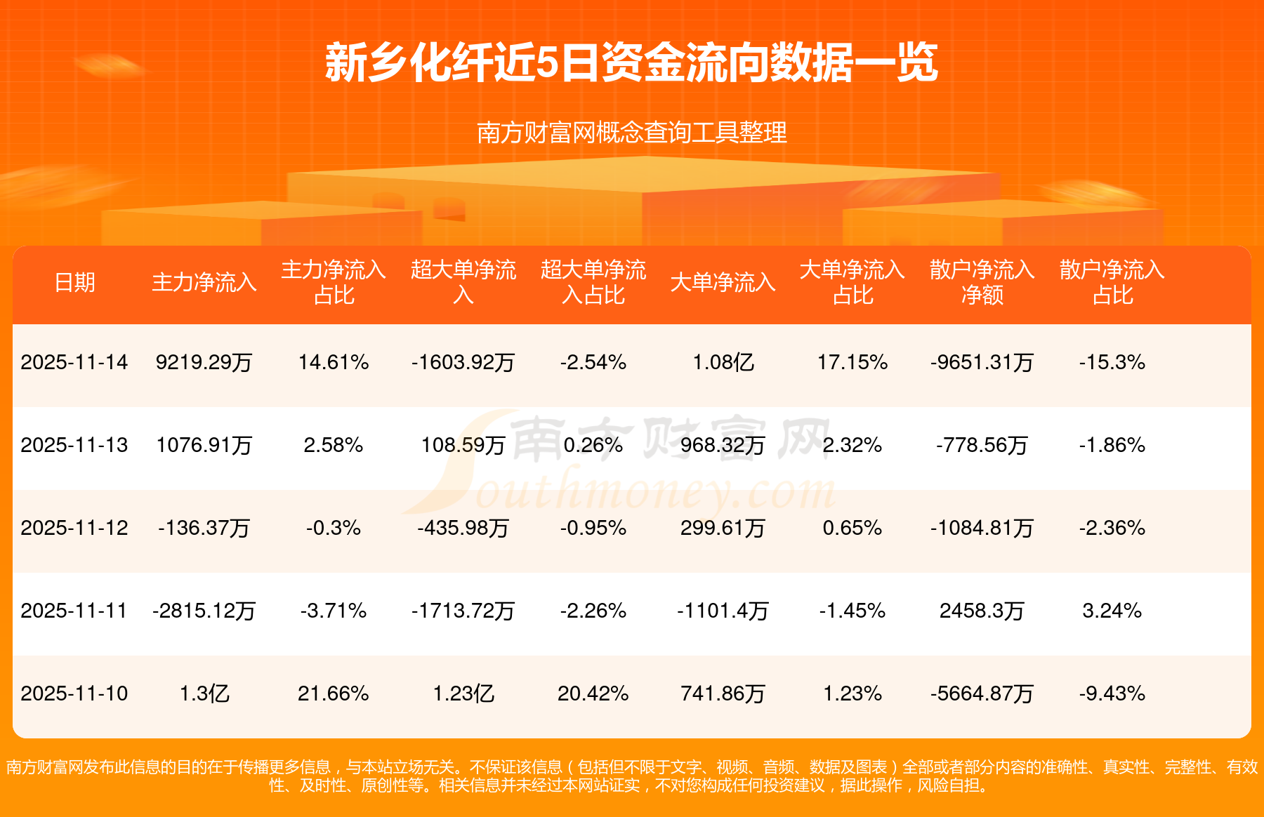 11月14日該股主力凈流入9219.29萬(wàn)元,超大單凈流出1603.92萬(wàn)元,大單凈流入1.08億元,中單凈流入432.03萬(wàn)元,散戶凈流出9651.31萬(wàn)元。