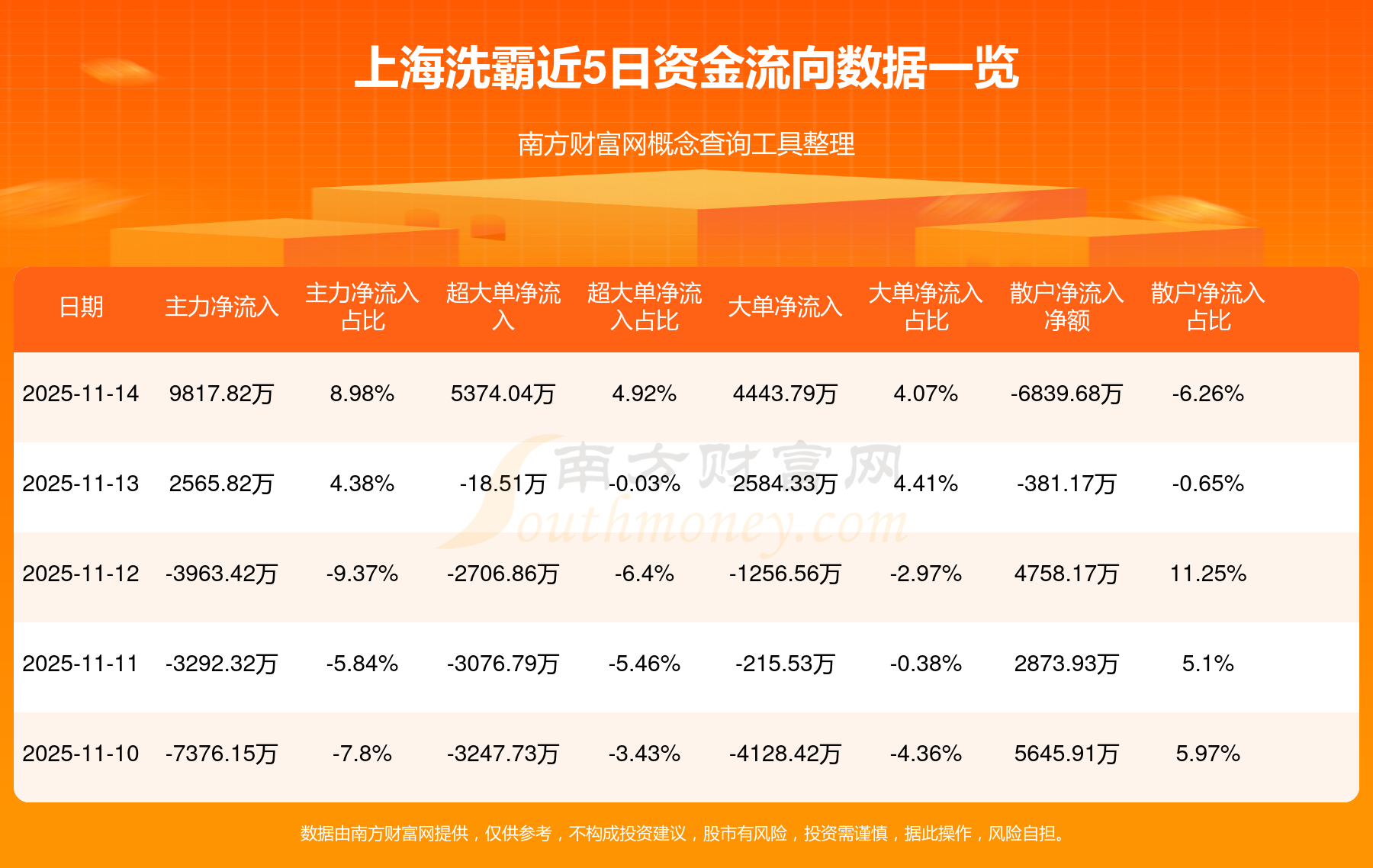 11月14日消息,上海洗霸資金凈流入9817.82萬元,超大單資金凈流入5374.04萬元,換手率7.77%,成交金額10.93億元。