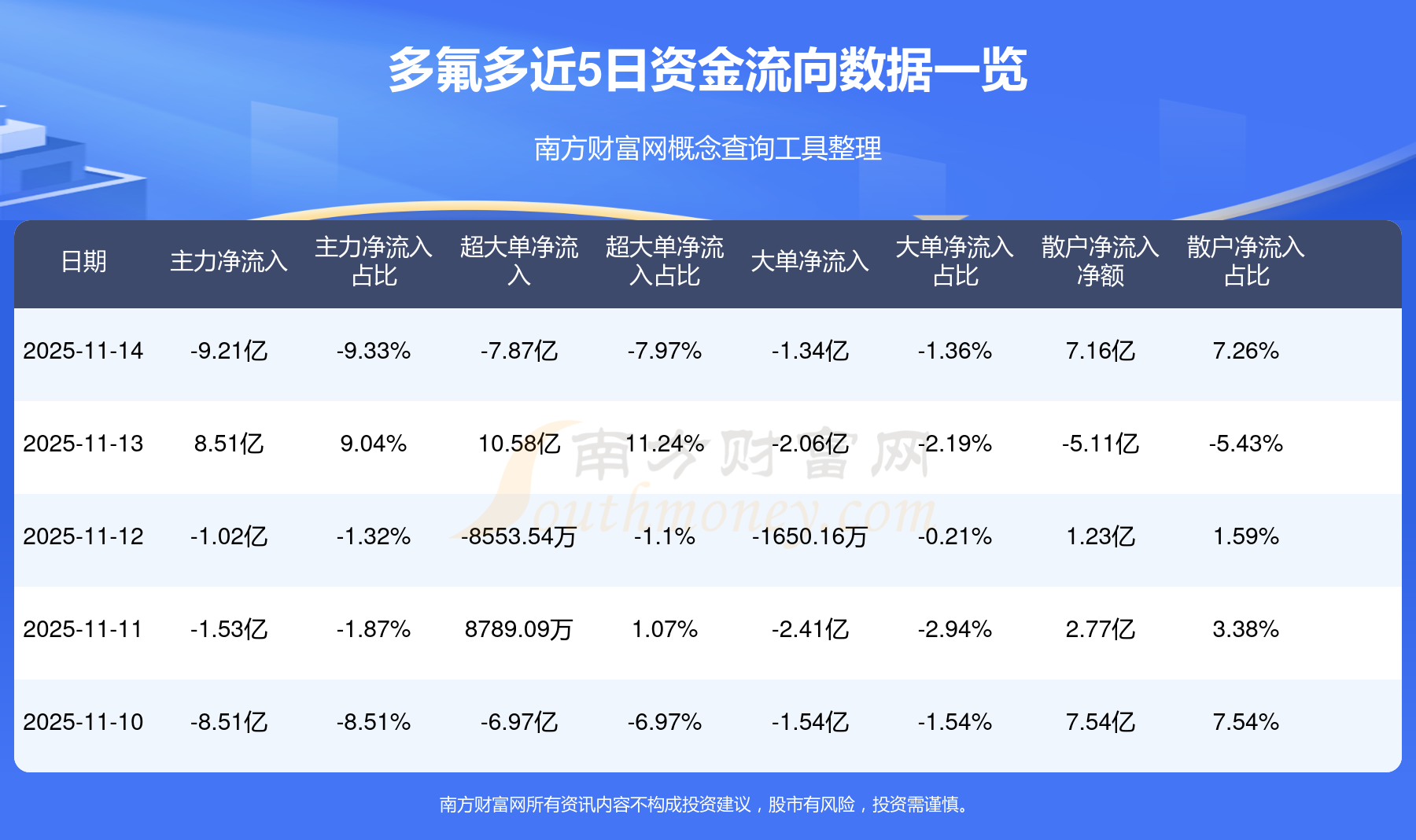 11月14日消息,多氟多主力資金凈流出9.21億元,超大單資金凈流出7.87億元,散戶資金凈流入7.16億元。