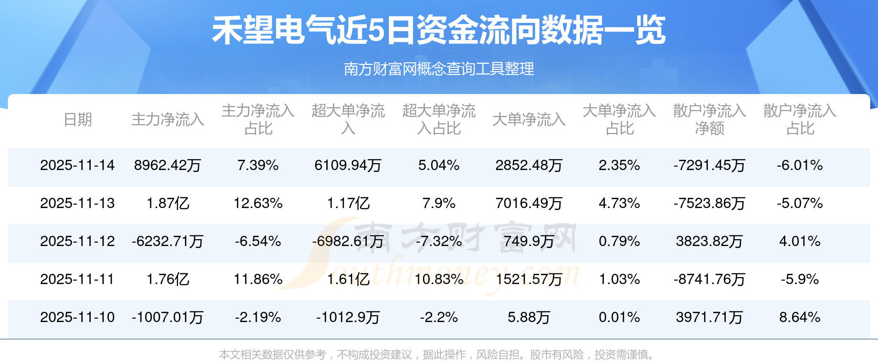 11月14日消息,禾望電氣11月14日主力凈流入8962.42萬(wàn)元,超大單凈流入6109.94萬(wàn)元,大單凈流入2852.48萬(wàn)元,散戶凈流出7291.45萬(wàn)元。