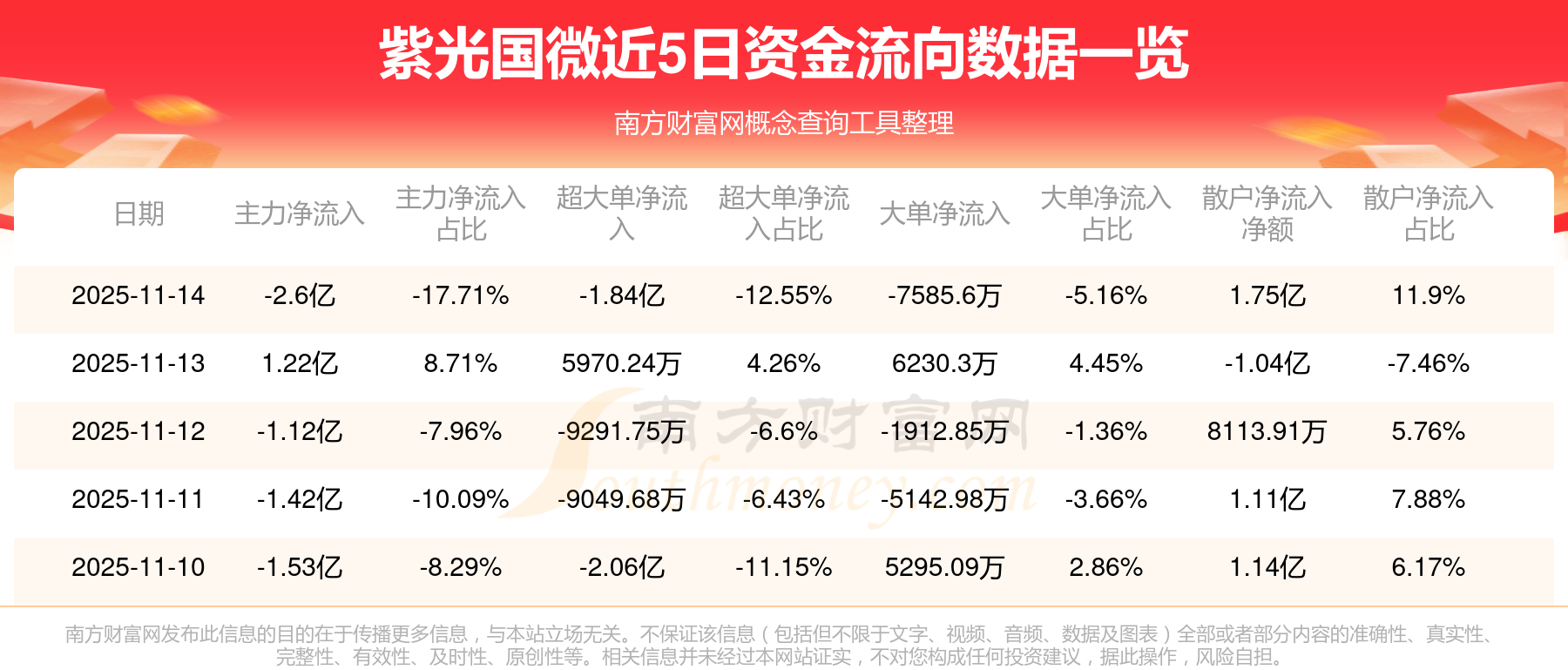 11月14日消息,紫光國微資金凈流出2.6億元,超大單凈流出1.84億元,換手率2.29%,成交金額14.69億元。
