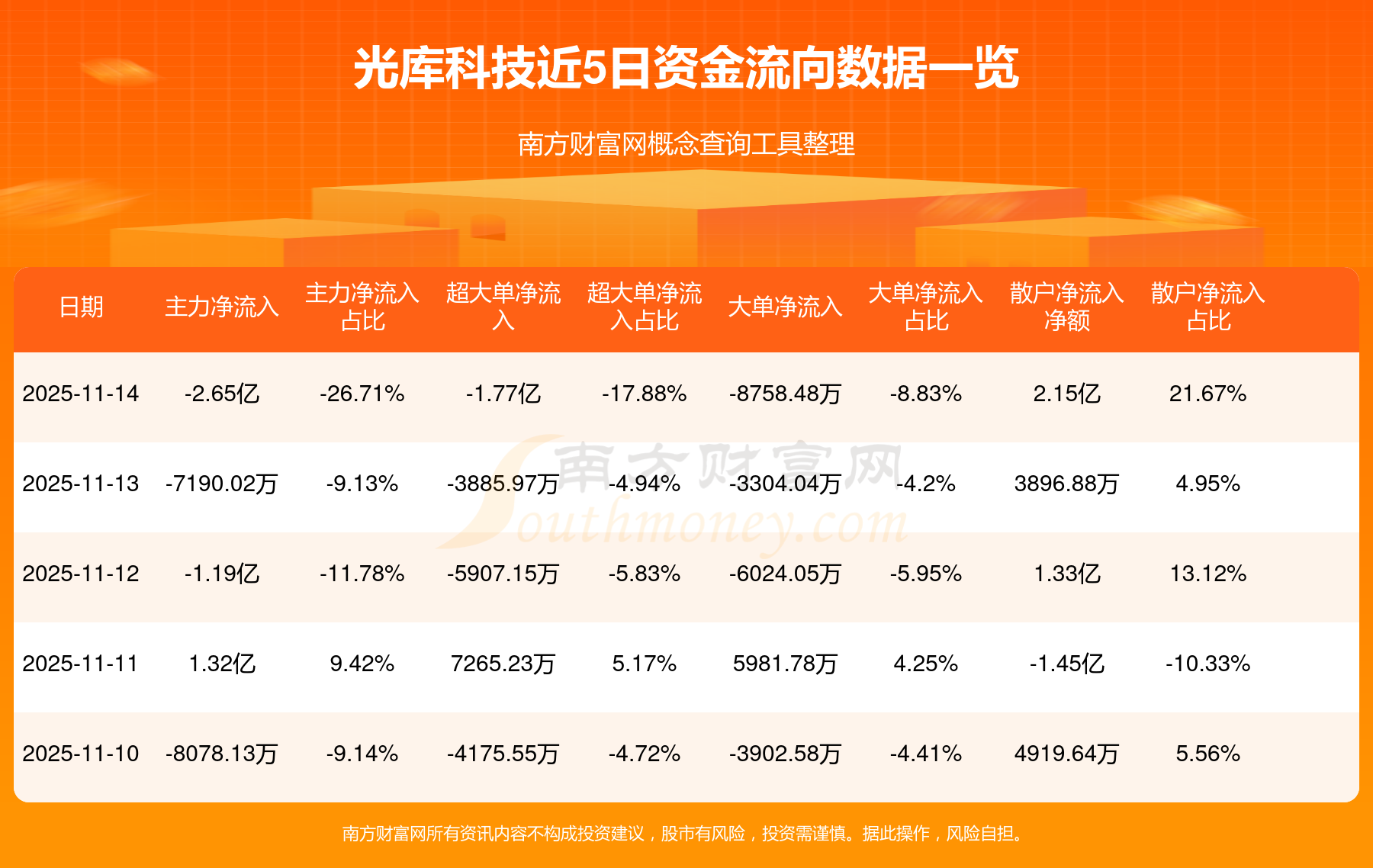 11月14日消息,光庫科技資金凈流出2.65億元,超大單資金凈流出1.77億元,換手率4.11%,成交金額9.92億元。