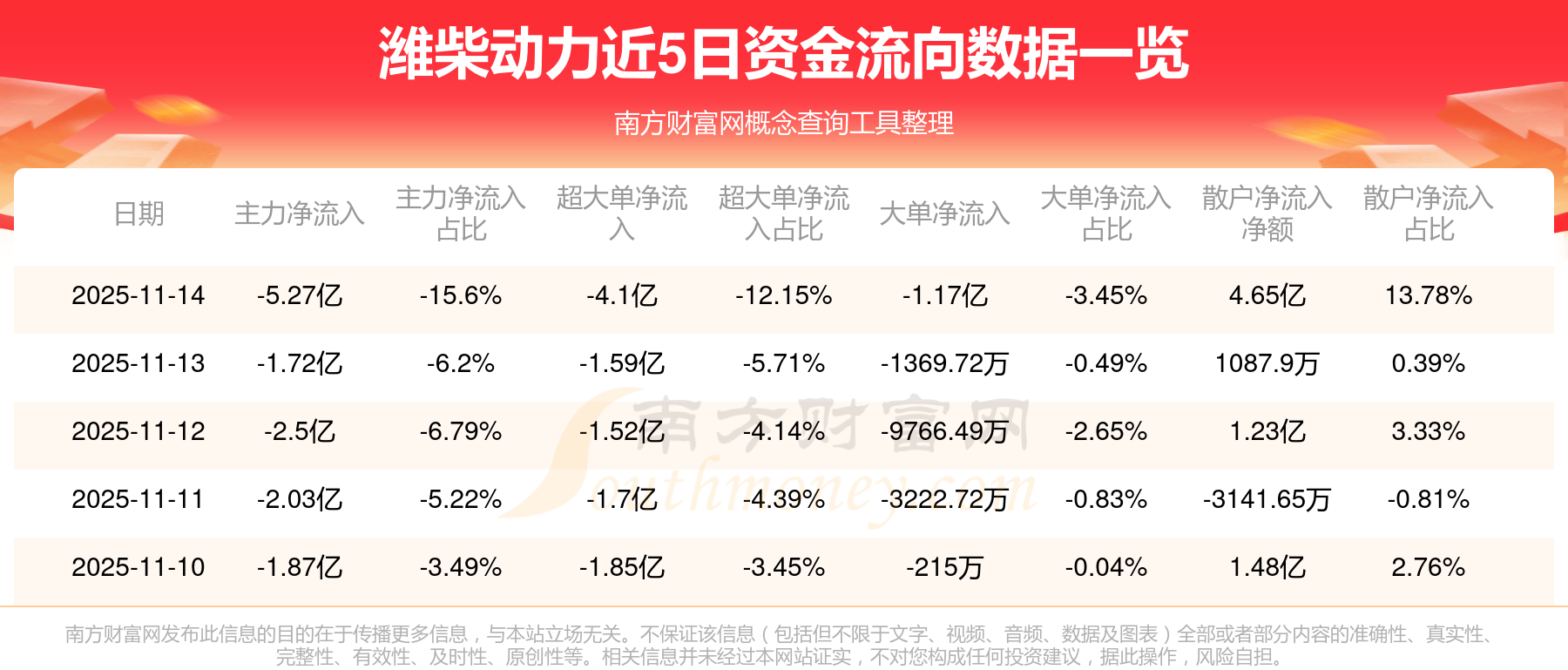 11月14日消息,濰柴動力主力凈流出5.27億元,超大單凈流出4.1億元,散戶凈流入4.65億元。