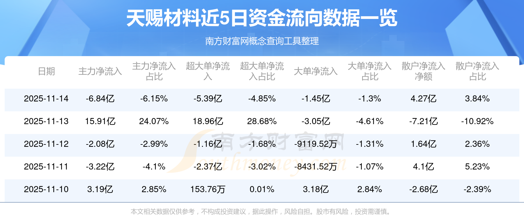 11月14日消息,資金凈流出6.84億元,超大單凈流出5.39億元,成交金額111.21億元。