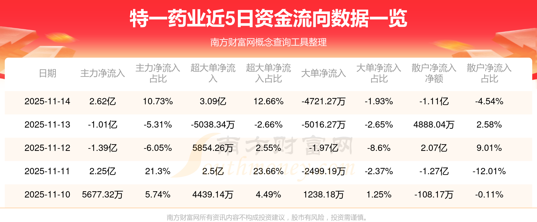 11月14日消息,特一藥業(yè)11月14日主力凈流入2.62億元,超大單凈流入3.09億元,大單凈流出4721.27萬元,散戶凈流出1.11億元。