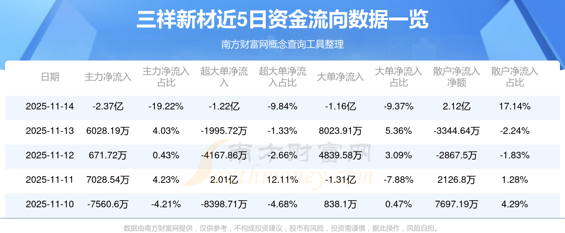 11月14日消息,三祥新材主力凈流出2.37億元,超大單凈流出1.22億元,散戶凈流入2.12億元。