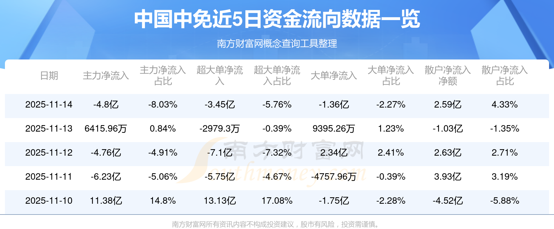 11月14日消息,中國中免主力資金凈流出4.8億元,超大單資金凈流出3.45億元,散戶資金凈流入2.59億元。