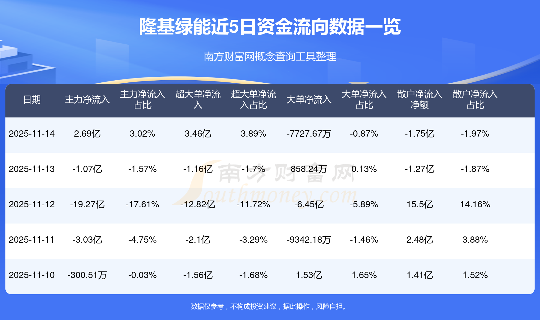 11月14日消息,隆基綠能11月14日主力資金凈流入2.69億元,超大單資金凈流入3.46億元,大單資金凈流出7727.67萬元,散戶資金凈流出1.75億元。