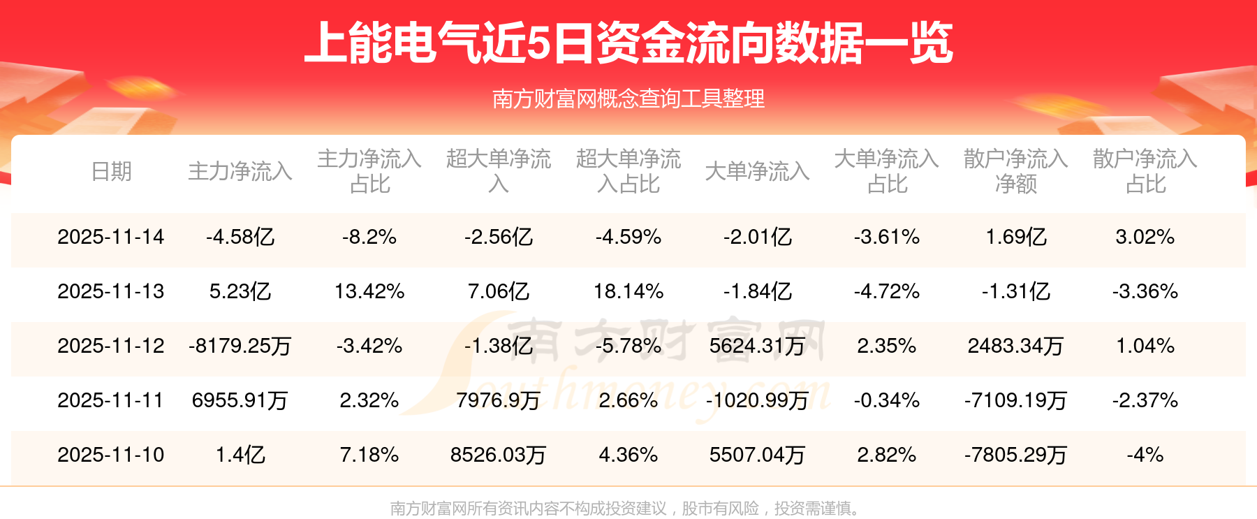 11月14日該股主力資金凈流出4.58億元,超大單資金凈流出2.56億元,大單資金凈流出2.01億元,中單資金凈流入2.89億元,散戶資金凈流入1.69億元。