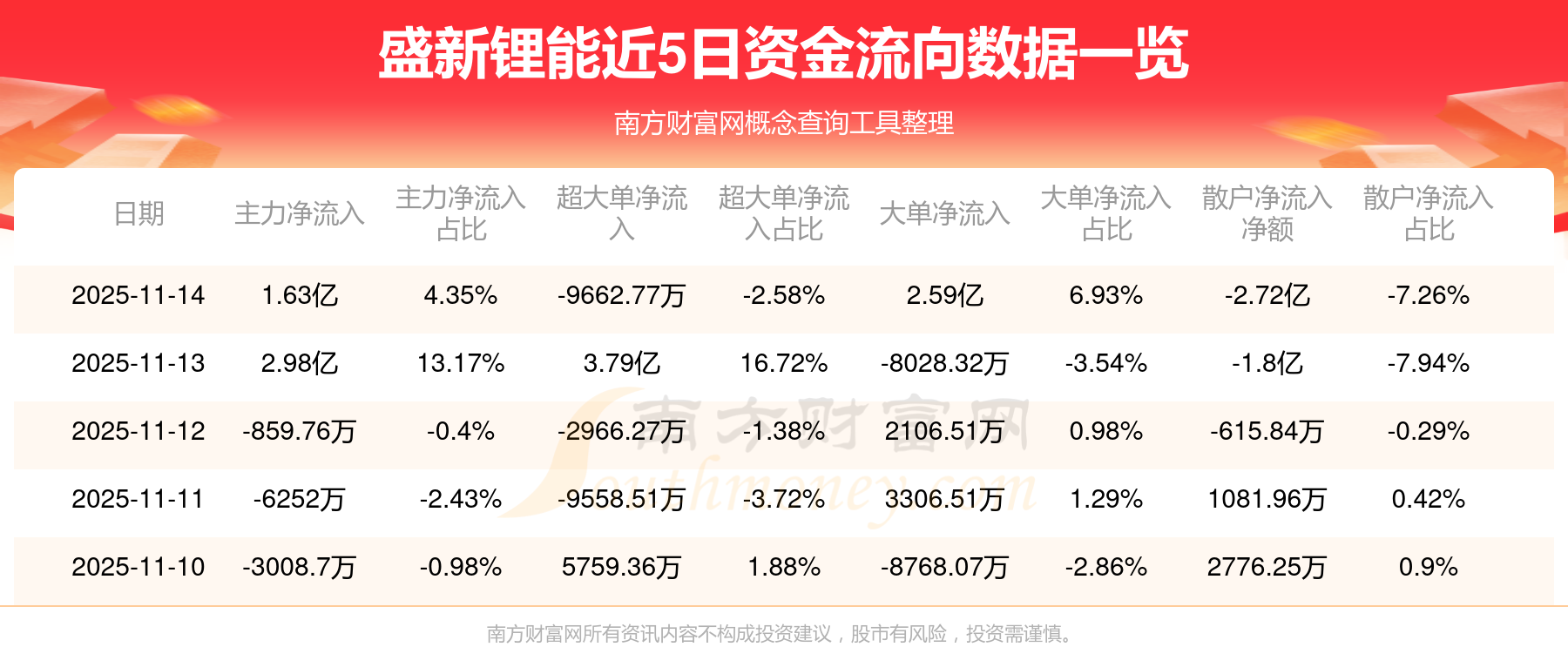 11月14日消息,盛新鋰能11月14日主力資金凈流入1.63億元,超大單資金凈流出9662.77萬(wàn)元,大單資金凈流入2.59億元,散戶資金凈流出2.72億元。
