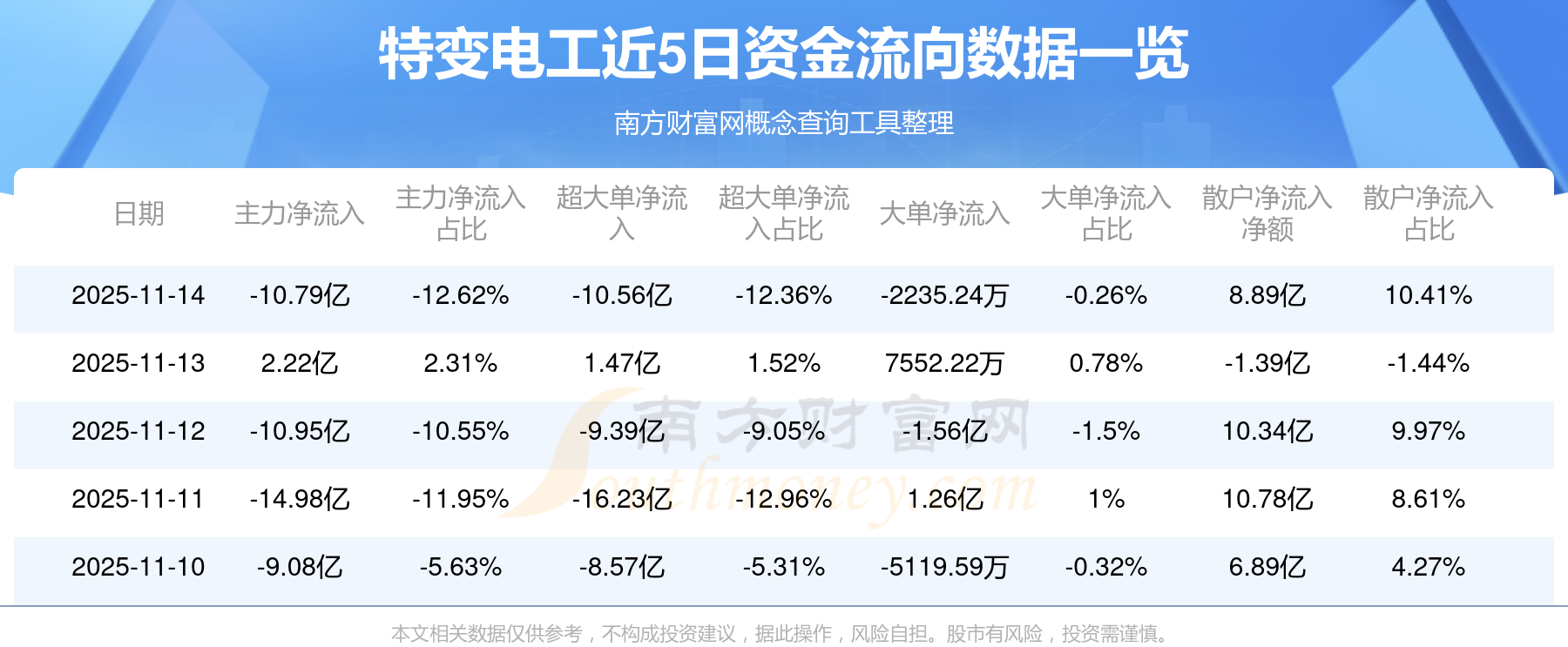 11月14日主力資金凈流出10.79億元,超大單資金凈流出10.56億元,換手率6.96%,成交金額84.25億元。