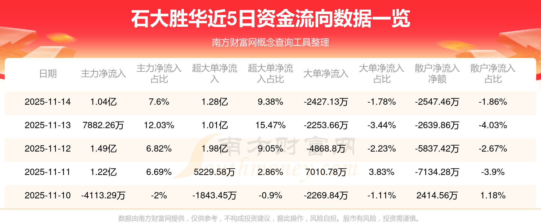 11月14日消息,石大勝華資金凈流入1.04億元,超大單資金凈流入1.28億元,換手率6.8%,成交金額13.67億元。