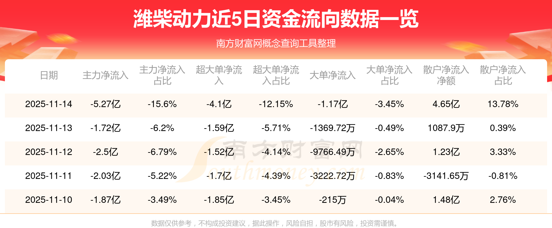 11月14日消息,濰柴動力主力凈流出5.27億元,超大單凈流出4.1億元,散戶凈流入4.65億元。