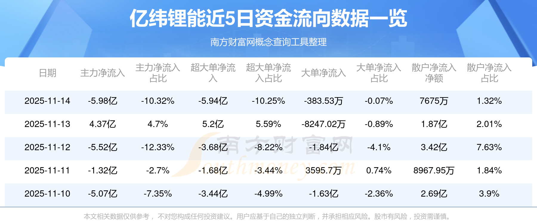 11月14日消息,億緯鋰能資金凈流出5.98億元,超大單資金凈流出5.94億元,換手率3.71%,成交金額57.93億元。