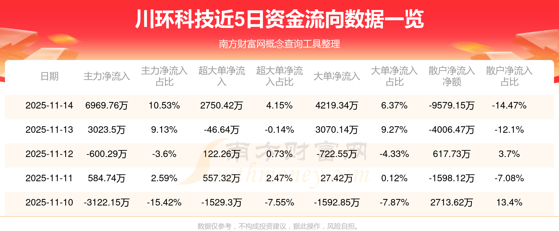 11月14日消息,川環(huán)科技11月14日主力凈流入6969.76萬元,超大單凈流入2750.42萬元,大單凈流入4219.34萬元,散戶凈流出9579.15萬元。