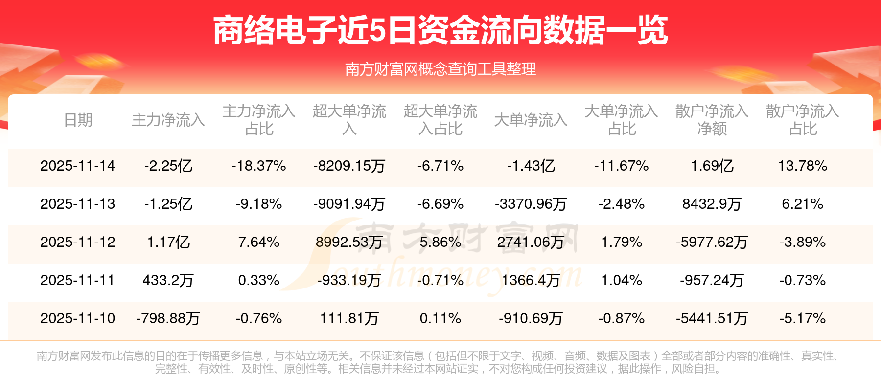 11月14日消息,商絡(luò)電子11月14日主力凈流出2.25億元,超大單凈流出8209.15萬元,大單凈流出1.43億元,散戶凈流入1.69億元。