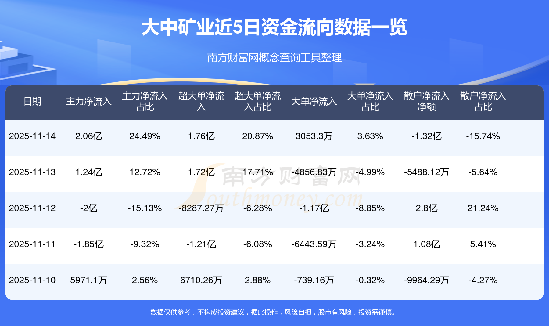 11月14日消息,大中礦業(yè)主力凈流入2.06億元,超大單凈流入1.76億元,散戶凈流出1.32億元。