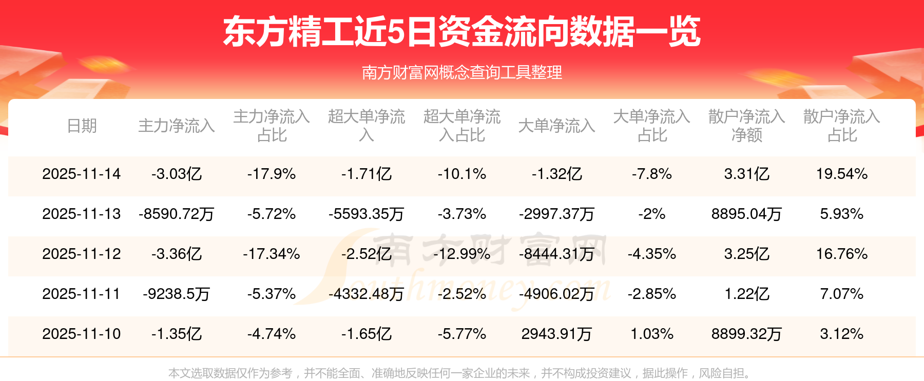 11月14日消息,東方精工11月14日主力凈流出3.03億元,超大單凈流出1.71億元,大單凈流出1.32億元,散戶凈流入3.31億元。