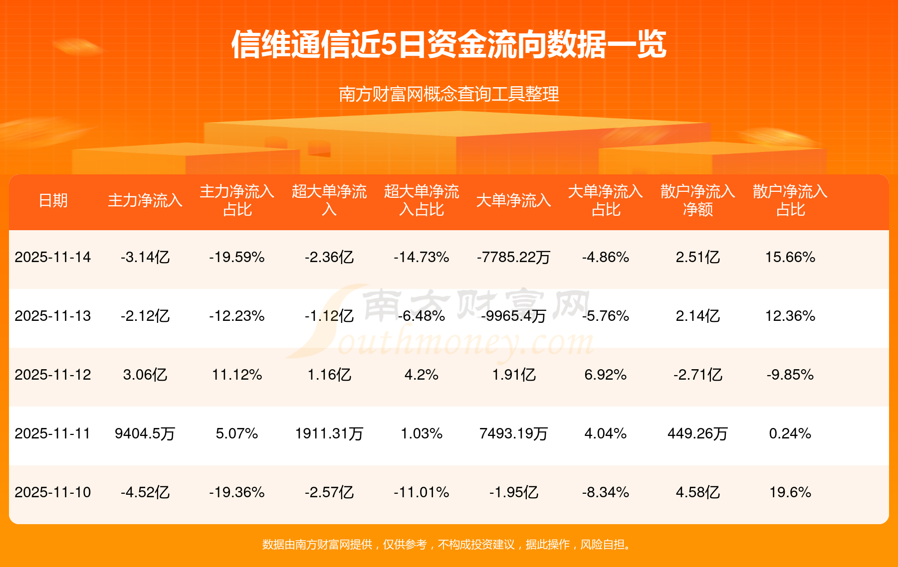 11月14日消息,信維通信主力資金凈流出3.14億元,超大單資金凈流出2.36億元,散戶資金凈流入2.51億元。