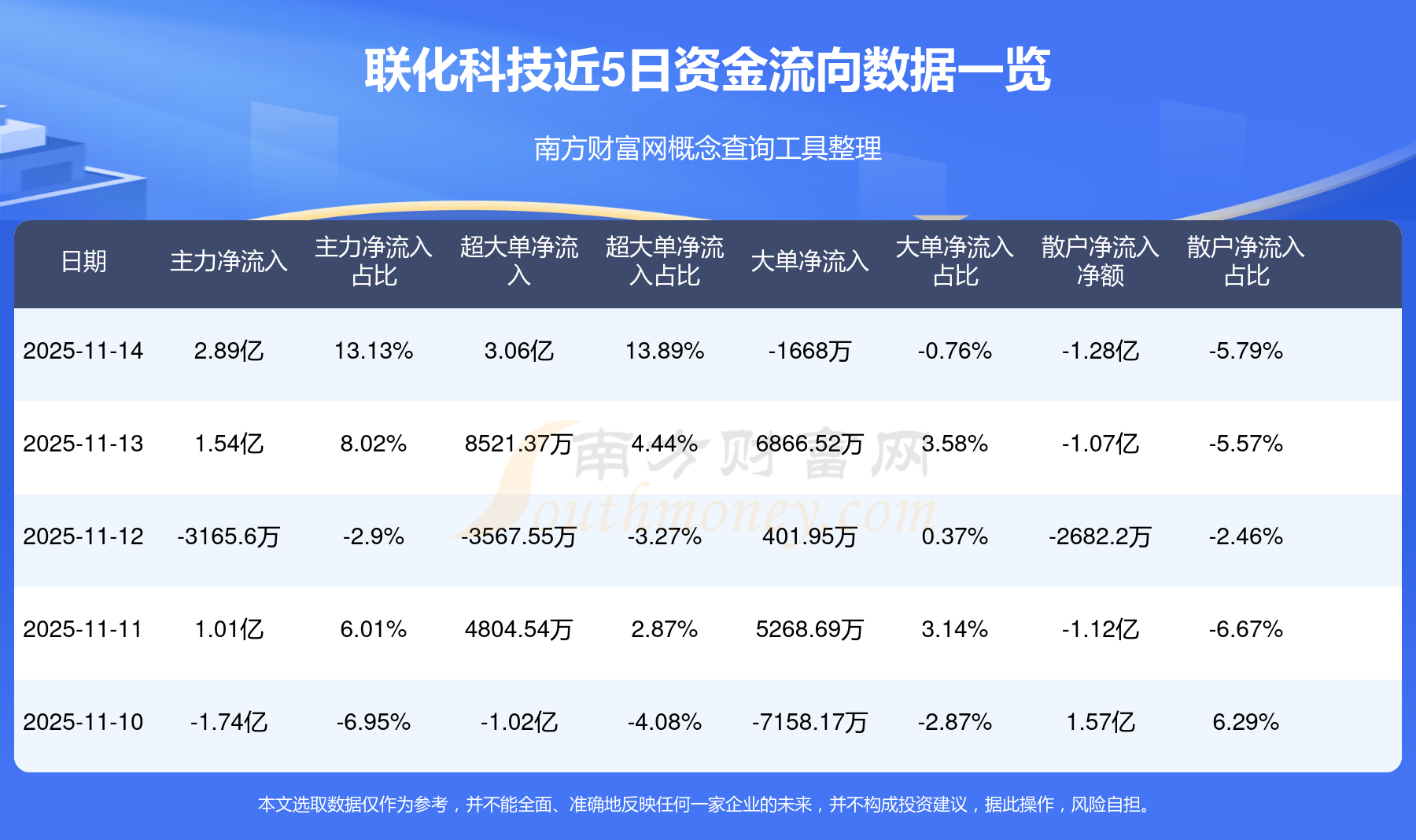 11月14日消息,聯(lián)化科技11月14日主力資金凈流入2.89億元,超大單資金凈流入3.06億元,大單資金凈流出1668萬元,散戶資金凈流出1.28億元。
