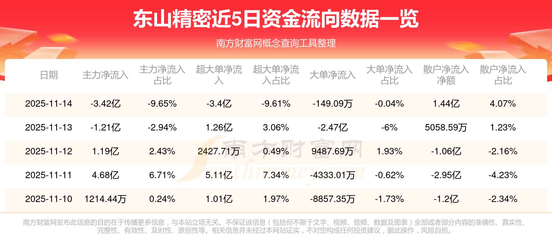 11月14日消息,東山精密11月14日主力凈流出3.42億元,超大單凈流出3.4億元,大單凈流出149.09萬元,散戶凈流入1.44億元。