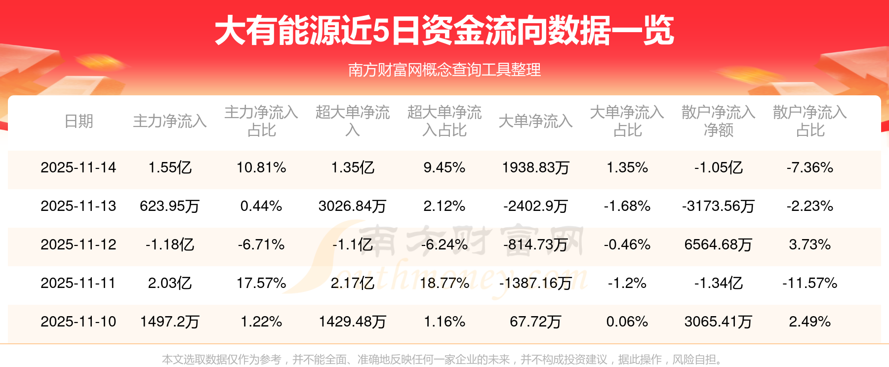 11月14日消息,大有能源資金凈流入1.55億元,超大單資金凈流入1.35億元,換手率6.19%,成交金額14.32億元。
