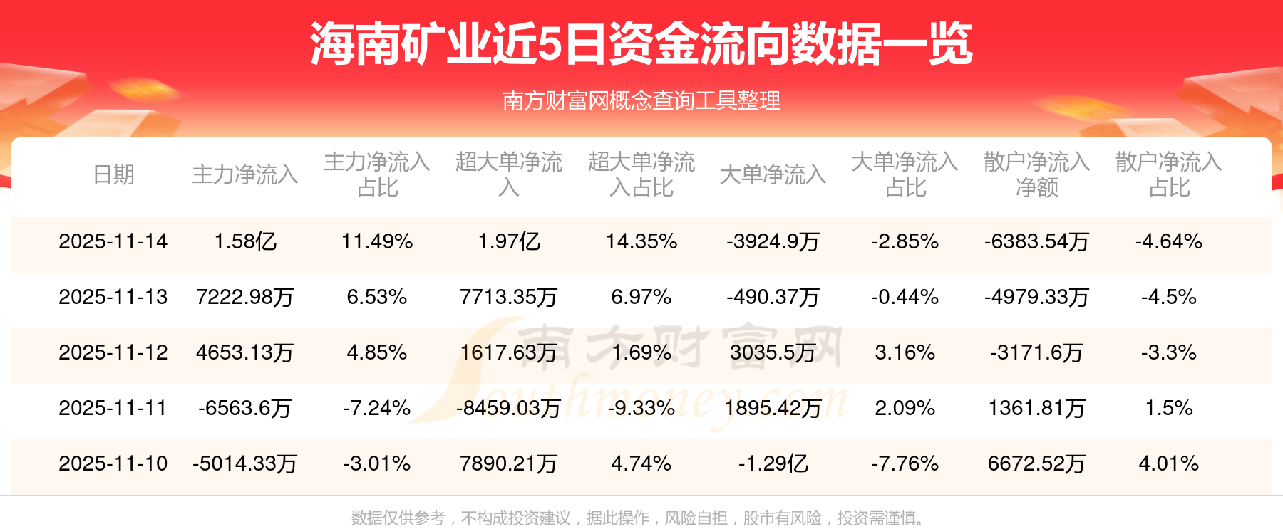 資金流向數(shù)據(jù)方面,11月14日主力資金凈流流入1.58億元,超大單資金凈流入1.97億元,大單資金凈流出3924.9萬(wàn)元,散戶(hù)資金凈流出6383.54萬(wàn)元。