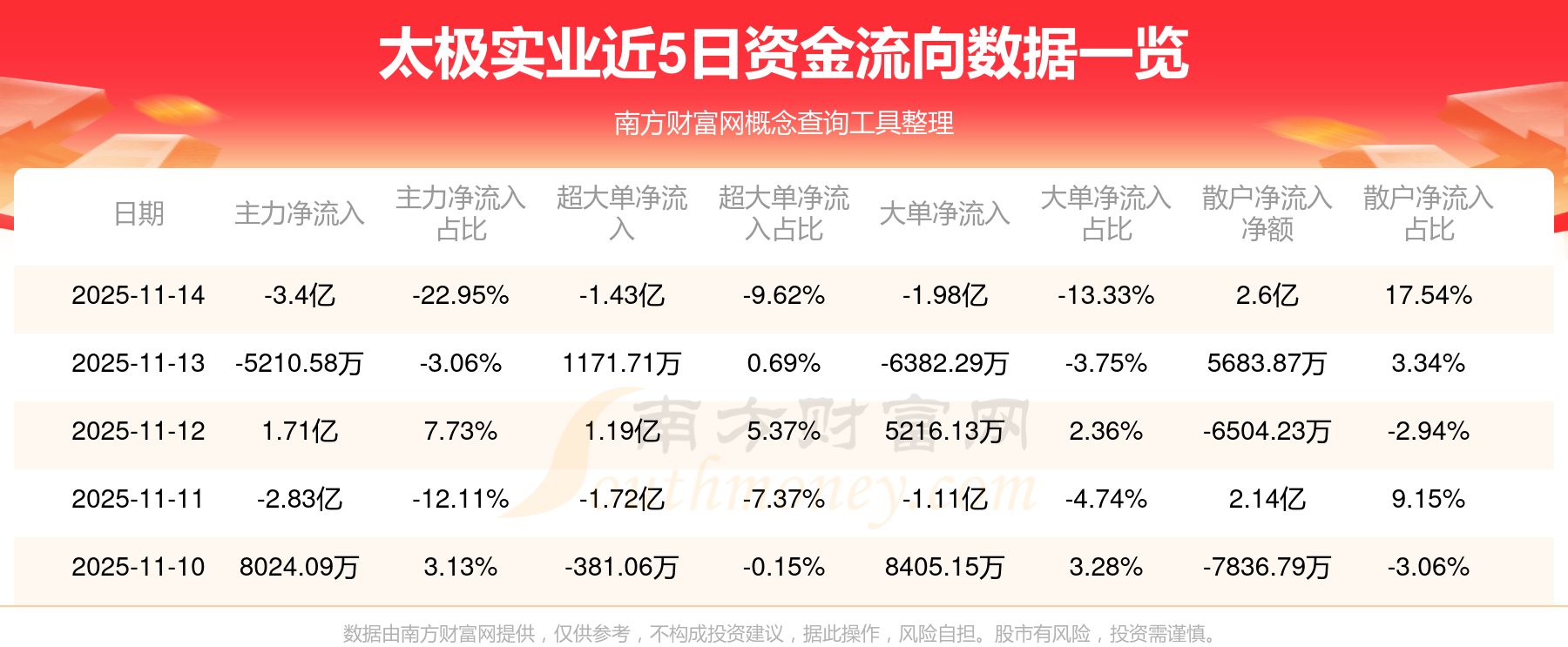 11月14日消息,太極實業(yè)主力凈流出3.4億元,超大單凈流出1.43億元,散戶凈流入2.6億元。
