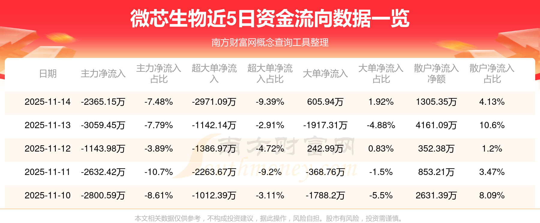 11月14日消息,微芯生物資金凈流出2365.15萬元,超大單資金凈流出2971.09萬元,換手率2.57%,成交金額3.16億元。