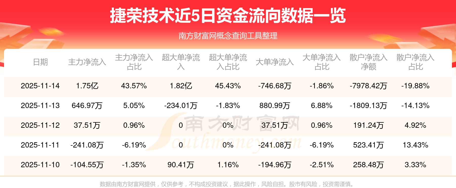 11月14日消息,捷榮技術(shù)主力資金凈流入1.75億元,超大單資金凈流入1.82億元,散戶資金凈流出7978.42萬(wàn)元。