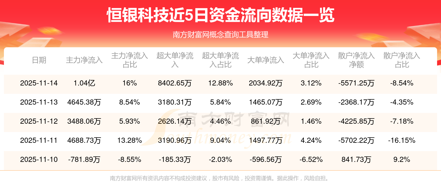 【11月14日】今日恒銀科技(603106)主力凈流入凈額1.04億元,占比16.00%。該股開盤報11.38元,收于12.030元,漲3.84%,總市值為62.62億元,換手率10.32%。