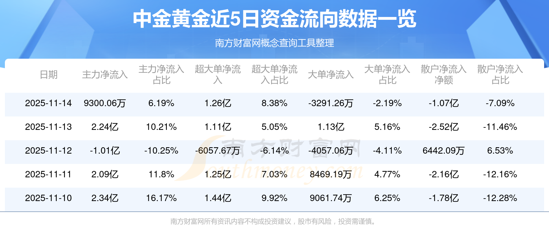 11月14日消息,中金黃金主力資金凈流入9300.06萬元,超大單資金凈流入1.26億元,散戶資金凈流出1.07億元。