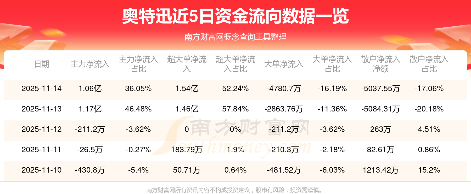 資金流向數(shù)據(jù)方面,11月14日主力資金凈流流入1.06億元,超大單資金凈流入1.54億元,大單資金凈流出4780.7萬元,散戶資金凈流出5037.55萬元。