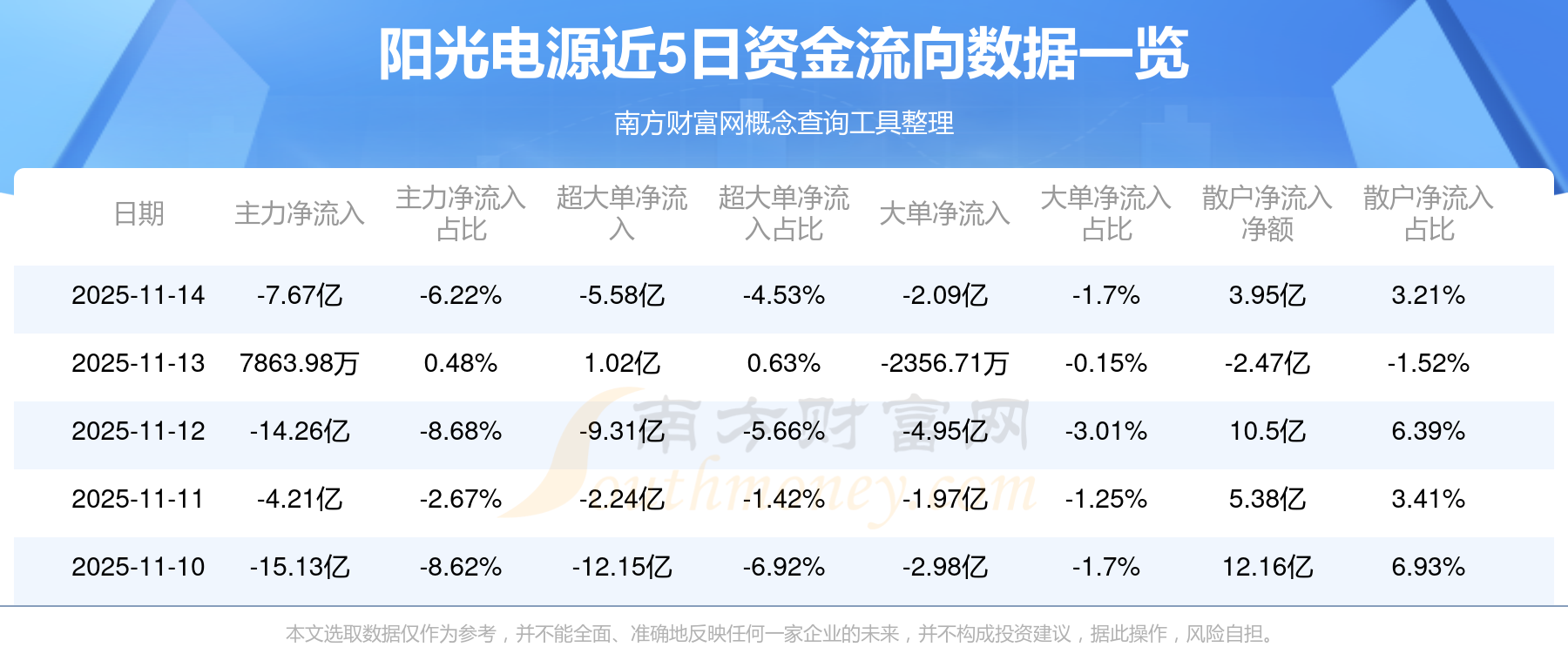 11月14日消息,陽光電源主力資金凈流出7.67億元,超大單資金凈流出5.58億元,散戶資金凈流入3.95億元。